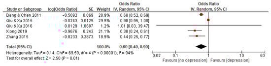 Five studies with a total of 10,113 subjects reported an association between BC and depression. The random effects model was used because the statistical heterogeneity of the included studies was significant (I2 = 94%). The results showed that the association between BC and depression was significant, with a pooled OR and 95% CI of 0.60 [0.40–0.90] (see Figure 6).