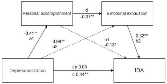 Figure 1. Serial mediation model of despersonalisation on daily activities through Personal Accomplishment and Emotional Exhaustion. * p < 0.05; ** p < 0.01.