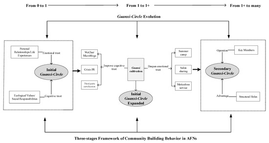As social innovations that help to transition towards a more sustainable food system, alternative food networks (AFNs) in China have attracted much scholarly attention in recent years. However, studies of the community building behavior of AFNs at the micro-level in the Chinese social context are scant. Through in-depth case studies conducted between 2017 and 2021 and social network analysis, our study examines how founders of AFNs successfully facilitate community building among their customers. We find that in China, the traditional social-cultural construct, guanxi, plays a critical role in AFNs’ community formation and expansion. The study identifies a three-stage framework for understanding the community building process of AFNs. First, a group of guanxi of the same kind would form a guanxi-circle. Second, the initial guanxi-circle is enhanced and expanded to multiple secondary guanxi-circles. Third, these multiple guanxi-circles together and the interactions among them constitute the community of AFNs. We argue that to strengthen the community, AFNs operators should inspire key members to form secondary guanxi-circles by enhancing their cognitive trust and emotional trust.