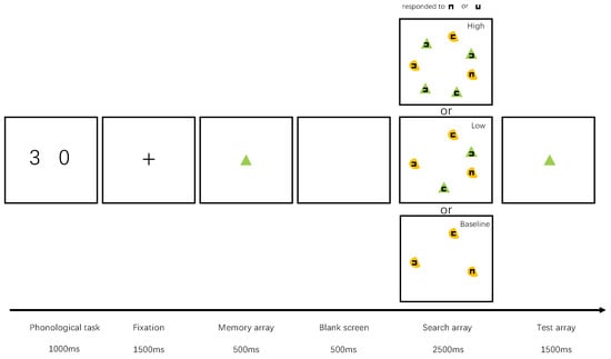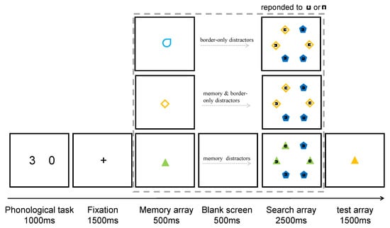 Experiment 1 used a dual-task paradigm that has been commonly used in previous studies [20,21]. The experimental process is shown in Figure 1. First, two different numbers between 0 and 9 (0.8° × 1.2°) were presented on the left and right sides of the monitor (1.8° from the center) for 1000 ms. Participants were required to verbally repeat these two numbers during the rest of the trial to reduce the impact of speech coding on the experimental task [22]. Next, referring to the time setting in the previous study [15], a fixation cross was presented for 1500 ms, followed by the item to be held in memory for 500 ms. Participants were asked to concentrate and memorize the item during its brief appearance. After a subsequent 500 ms blank screen, the search array appears for 2500 ms. The search array consisted of multiple visual stimuli that were randomly distributed at 12 possible points around the edge of a virtual circle with a radius of 3°. Each stimulus was presented 3° from the center and the minimum distance between items was 1.5° to ensure that the items did not interfere with each other. Participants needed to find the target and identify the location of its gap (top or bottom) by pressing the up or down arrow keys on the keyboard (“5” for up; “1” for down). It should be noted that there was only one search target and its shape and color never matched those of the memory item. After the gap location was entered, a 1500 ms memory detection item was presented. Participants pressed the “Z” key if both the color and the shape of the presented item matched that of the memory item and pressed the “X” if it did not (“Z” for memory objects; “X” for non-memory objects). It is important to note that we clearly indicated during the instruction period that the shape and color of the target item would never match the shape and color of the memory item.