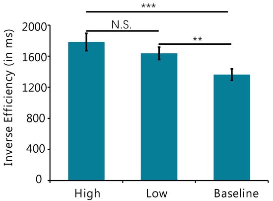 Inverse efficiency (by dividing the mean correct RTs by the proportion of correct responses) across conditions in Experiment 1. *** indicates p < 0.001; ** indicates 0.001 < p < 0.01; N.S. indicates p > 0.1.