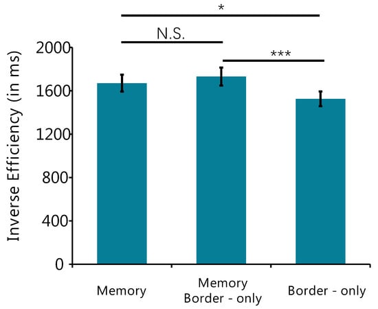 Inverse efficiency for the three conditions. Error bars are SEM. * indicates p < 0.05; *** indicates p < 0.001; N.S. indicates p > 0.1.