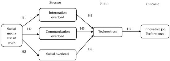 Moreover, technostress has also negatively affected employees’ innovativeness due to the imbalanced relationship between environmental demands (social media use) and exceeding their coping abilities. This threat can negatively impair their creative and critical thinking to produce or adopt, promote, and implement novel ideas [,,]. Therefore, it is posited that technostress resulting from social media overloads may reduce innovative performance, as supported by previous studies [,]. Therefore, the hypothesis is as follows:
