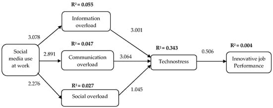 The result shows that five of the seven proposed hypotheses were supported. As hypothesized, H1, H2, and H3 were supported as social media use at work has a positive influence on information overload (β = 0.234, t = 3.078), communication overload (β = 0.216, t = 2.891), and social overload (β = 0.164, t = 2.276). The R2 of the three variables are 0.055 (Q2 = 0.031), 0.047 (Q2 = 0.031), and 0.027 (Q2 = 0.017), denoting that social media use at work explained 5.5%, 4.7%, and 2.7% of the variance, respectively. Next, H4 and H5 were accepted, which posited that information overload (β = 0.342, t = 3.001) and communication overload (β = 0.343, t = 3.064) showed a significant positive effect on employees’ technostress; meanwhile, social overload on employees’ technostress was not significant (β = −0.089, t = 1.045), thus, rejecting H6. The R2 was 0.343 (Q2 = 0.270), indicating that the three overloads explained 34.3% of the variance on technostress. Lastly, H7 (β = 0.065, t = 0.506) demonstrated that technostress was found to be insignificant towards innovative job performance among employees, with an R2 of 0.004 (Q2 = 0.000), which indicates that technostress explained 0.4% of the variance in innovative performance.
