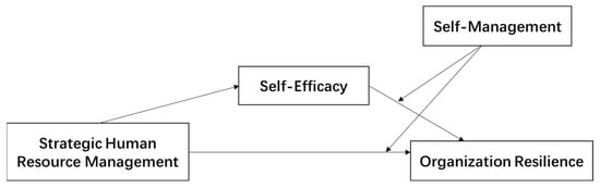 According to conservation of resources theory, organizational resilience is an essential intangible resource that allows the organization to survive and develop in adverse situations, thus enabling organizations to make decisive decisions in dynamic situations, flexibly deploy their internal and external resources, and take appropriate actions to ensure that the organization is always able to adapt to the business environment and obtain competitive advantage [11]. In times of crisis, only if the organization is united, determined, and confident can it seize the fleeting moment, make decisive decisions, and act efficiently to take full advantage of its own resilience. A high level of self-management ability on the part of employees, with good self-cognitive ability and the ability to obtain and process environmental information to ensure that they can quickly judge the situation in times of crisis and work in an orderly manner based on the situation, is target management. Thus, a high level of self-management can increase employees’ sense of psychological security and self-efficacy in times of crisis, thereby enhancing the resilience of the organization. Specifically, on the one hand, the process of self-management is driven by employees’ intrinsic values, and the achievement of the organization’s goals is a testament to employees’ self-worth [40]. Employees view the challenges presented by adversity as opportunities to prove their own ability and value. They view work as their responsibility and believe in accomplishing challenging goals by taking full advantage of their professional skills and creativity and working with other members of the organization to deal with environmental challenges and smoothly survive crises, thereby enhancing organizational resilience. On the other hand, employees with high levels of self-management are skilled at assessing their own abilities and performance levels or those of others as well as setting reasonable work goals and developing reasonable action strategies based on the resources and information that they obtain because employees who are skilled at self-management tend to take the initiative to collect and process environmental information, remain sensitive to the external environment and organizational operations, and ensure that they are always needed by the organization as a means of maintaining their competitive positions in the organization. In times of crisis, when the organizational landscape changes, employees quickly orient themselves to their goals with self-management ability, integrate their accessible resources, develop reasonable action plans and smoothly execute them, reduce their confusion and anxiety, increase their self-efficacy, and take full advantage of organizational resilience [41]. In conclusion, self-management can enhance the contribution of self-efficacy to organizational resilience. In summary, the following hypothesis is proposed.