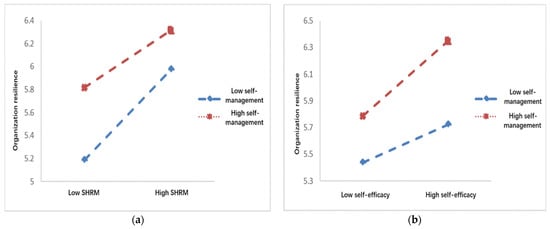 (a) The moderating role of self-management in the relationship between strategic human resource management and organizational resilience; (b) the moderating role of self-management in the relationship between self-efficacy and organizational resilience.