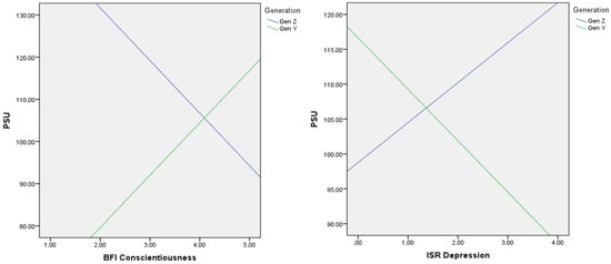 Figure 2 shows the interaction plot of the relationship between conscientiousness as well as depression symptoms and PSU by generation.