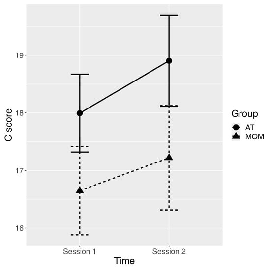 A Shapiro–Wilk’s test showed that the TCI character scores of C and ST scales were not normally distributed at Session 1 in the AT group (p < 0.05). On the basis of two 2 (Session: Session 1 and Session 2) × 2 (Group: MOM and AT) ANOVAs using robust M-estimator and 2000 bootstraps carried out on C and ST scores, there was a significant main effect of Session for the C scale (Session 2 > Session 1; ψ = −1.1, p = 0.001, see Table 1 and Figure 1). On the basis of a 2 (Session: Session 1 and Session 2) × 2 (Group: MOM and AT) repeated measures ANOVA carried out on SD scores, there was a significant main effect of Group (AT > MOM; F [1,66] = 4.861, p = 0.031; ηp2 = 0.069, see Table 1). No other main effects or interactions were significant (all p > 0.1). Thus, MOM and AT trainings led to higher scores on the cooperativeness scale at Session 2 than at Session 1.