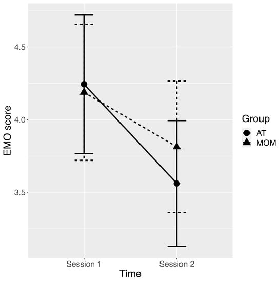 Plot of average scores in Emotional symptoms with error bars representing standard errors of the mean for pre-training assessment (Session 1) and post-training assessment (Session 2), and for AT (autogenic training) and MOM (mindfulness-oriented meditation) groups.