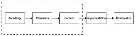 Rogers identified five stages of innovation: Knowledge, Persuasion, Decision, Implementation, and Confirmation []. In the decision phase, people choose whether they want to adopt or reject the innovation. This means that adoption is a stage of perception and intention for the pre-consultation of a new product. Our study focused on the first three parts of the model shown in Figure 1.