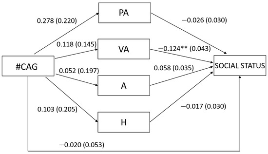 Unstandardized regression coefficients between the number of CAG repeats in the AR gene (#CAG) and social status mediated by physical aggression (PA), verbal aggression (VA), anger (A), and hostility (H) in men. Age was controlled in the model but excluded from the figure for clarity. The standard errors are shown in parentheses. ** p < 0.01.