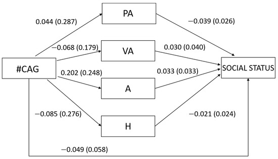 Unstandardized regression coefficients between the number of CAG repeats in the AR gene (#CAG) and social status mediated by physical aggression (PA), verbal aggression (VA), anger (A) and hostility (H) in women. Age was controlled in the model but excluded from the figure for clarity. The standard errors are shown in parentheses.