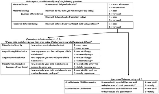 ESM collection was administered through Metricwire, a data-collection service utilizing a smartphone-based app (www.metricwire.com, accessed on 29 October 2021). Metricwire signaled AIMS-P Study mothers to complete end-of-day daily diaries on their smartphones between 7–11 pm for 28 days, with a reminder signal within one hour if they had not completed the survey. AIMS-P participants received $30 for completing at least 21 end-of-day surveys. The median number of completed surveys was 24 (M = 22.52, SD = 7.06, range from 6 to 29). The ESM protocol for the AIM-P Study utilized a branching approach (see Figure 1 for a summary of how items in the current study utilized branching). Mothers first provided an assessment of their daily stress as well as their coping (the latter involved an average of two questions). Mothers were then asked whether they had spent at least one full waking hour with the target child that day. Mothers who reported spending at least one hour with their child were asked to characterize the target child’s behavior that day. Depending on their characterization of their child’s behavior, they either reported on child misbehavior (severity, anger during the misbehavior and currently, and an average score of two items on negative child intent attributions) or they reported on child good behavior (child personality or mood).