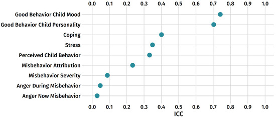 Figure 2 displays the ICCs sorted from largest to smallest. The largest ICCs, both greater than 0.70, were for mothers’ attribution of positive behavior to the child’s personality or good mood. The high ICCs indicate that variation in these attributions was largely a matter of individual differences between mothers, not contextual factors that varied from day to day, implying mothers’ perceptions of more trait-like characteristics were ascribed for good behavior. Otherwise, the remaining ICCs were below 0.50, indicating that most of the variance was at the within-person, day-to-day level. The lowest ICCs were for ratings of anger and for the severity of misbehavior. Nearly all the variance was at the within-person level, which means that mothers’ ratings about themselves (stress and coping) and their children’s behavior (particularly misbehavior) were largely driven by factors that varied from day to day.