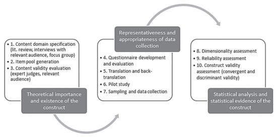 The researchers of this study streamlined the methodology described by Slavec and Drnovesek [7] to assess the procedures used to develop a measuring instrument. As illustrated in Figure 1, they introduced ten steps grouped into three phases: “(1) the theoretical importance and existence of the construct, (2) the representativeness and appropriateness of data collection, and (3) statistical analysis and statistical evidence of the construct” [7].