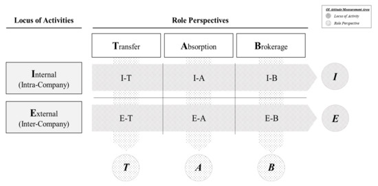 While the authors mentioned above discussed the processes or functions of OI activities, this paper focuses on assessing the OI attitudes of an organization in an ecosystem to evaluate its current status pertaining to OI performance. Thus, this paper investigates the role of firms in the market, whereas previous literature focused on the flow of knowledge. Therefore, the perspective-oriented approach is more appropriate for measuring attitudes at the firm level. During the research, the attitude measurement questionnaire was composed according to an organization’s position from the role perspectives: transfer, absorption, and brokerage.