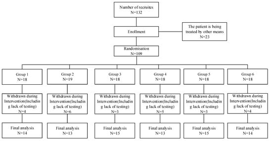 This study was a controlled study to explore the effects of different exercise intensity and frequency on anxiety, depression and sleep quality of college students with anxiety disorder. College students participating in this study were recruited at the College Student Health Guidance Center. Recruitment was based on screening according to the Diagnostic and Statistical Manual of Mental Disorders (DSM-5) Anxiety Diagnostic Principles, which include separation anxiety disorder, generalized anxiety disorder, panic disorder, and social anxiety disorder. Participants were given oral and written notice at the time of recruitment and then were asked to sign a written informed consent. College students with anxiety disorders included in this study ranged in age from 19 to 29 years old, and included undergraduate, master, and doctorate students. The criteria for inclusion in this study were patients who did not use anti-anxiety medication; those with physical illnesses were excluded; those who had suffered serious physical injuries (such as fractures) within one year were excluded; those with severe mental illness diseases (psychosis) were excluded; patients who had been assessed by the Health Guidance Center as unsuitable to participate in the experiment were excluded. Additional exclusion criteria were subjects who did not complete the experiment in accordance with the experimental regulations, dropped out halfway, or exercised more than once a week outside the experiment. A total of 132 individuals were recruited at the beginning of this study. After screening, 23 individuals who did not meet the criteria of the study were excluded. Then the remaining 109 individuals were divided into 6 groups according to the random grouping software (version 1.0) (China, the LEO software studio), and sex and age were randomly distributed to ensure homogeneity. The 6 groups (low/high exercise intensity × low/moderate/high exercise frequency) were given the exercise intervention for 6 weeks (60 min each time) to observe the effects of different combinations of exercise intensity and frequency on anxiety, depression and sleep quality of college students. After the experiment, 25 individuals were excluded, and a total of 84 individuals were included in the final analysis, including 51 males and 33 females. The test samples met the needs of the study (Figure 1).