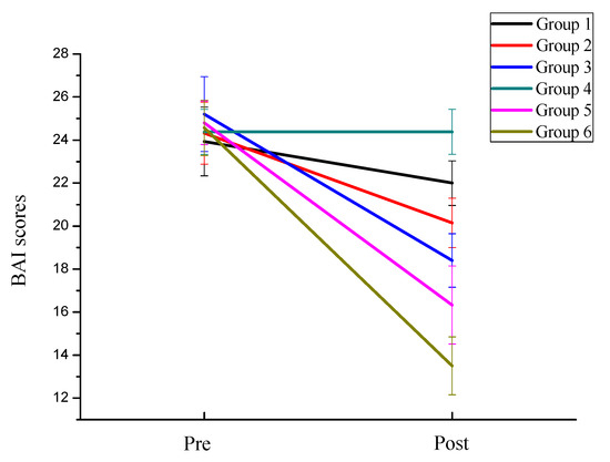 The trend of anxiety symptoms of the six groups of subjects.