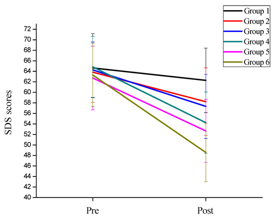 The trend of depression symptoms of the six groups of subjects.