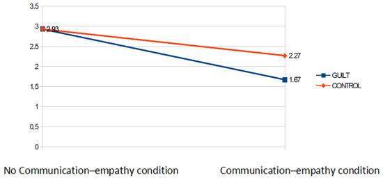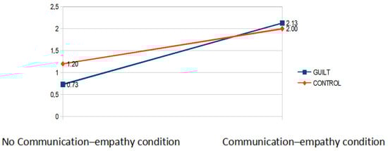 Dependent Variable: Tickets for oneself. A 2 (emotion condition: guilt vs. control) × 2 (communication condition: empathy vs. no communication) analysis of variance with tickets allocated to oneself showed significant main effects of the empathy condition, F(1,56) = 38.99, p ≤ 0.001, η2 = 0.38 and of guilt F(1,56) = 3.75, p = 0.058, η2 = 0.037. The mains effects were qualified by an interaction guilt X empathy F(1,56) = 3.70, p = 0.05, η2 = 0.036. Post-hoc pairwise comparison with Bonferroni correction revealed that participants in the communication–empathy condition offered significantly fewer tickets to themselves in the guilt condition than they did in the control condition, t(56) = −3.04 p = 0.004. By contrast, there was no difference between the guilt and control condition with regard to participants in the no-communication condition t(56) = 3.55e, p = 0.98 (see Figure 1).