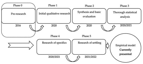 From the point of view of the structure of the study, the following chapters will build on the introduction, which synthesizes and presents the reference resources in chronological order. The theoretical framework was complemented by the results of our research [,,,,]. The aim of the synthesis was to define a research problem and formulate research questions. Based on this framework, we will further describe the methodology, which will be complemented by the visualization of individual research phases. The research results are presented and discussed in the next chapter. Finally, an empirical model is completed, visualized, and described as a final output of eighteen months of efforts of the authors to find an answer to the research question. In the conclusion, the results of the research are evaluated and the basic implications for science and practice are specified.