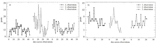 The development of the number of posts over time across the three observation periods is shown in Figure 2. Based on this graphical comparison, it is possible to consider the trend during the working days in the first and third observation as similar or identical. Higher variability is reported in the second observation, but this is attributed to the Christmas holidays. The trend during the weekend is continual, with a slight decrease in the number of posts in absolute terms.