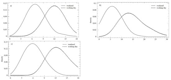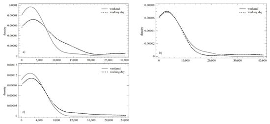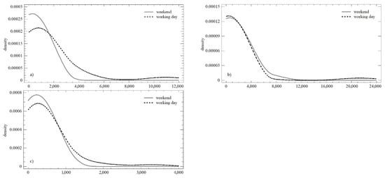 During the working days, statistically significant differences in the mean value (median) were not confirmed (Q = 1.331; p = 0.513). However, differences in variance were confirmed (LE = 8.664; p < 0.01), which reflected the above-mentioned reduction in differences in daily values over time. Similar conclusions could be made for weekends (LE = 8.147; p < 0.01; Q = 2.532; p = 0.281). A comparison of the weekend and the working days within all three observation periods is presented in Figure 5. The distribution functions shown in each of the observation periods could be described as identical (K-Sobs1 = 0.768; p = 0.596; K-Sobs2 = 0.759; p = 0.611; K-Sobs3 = 0.726; p = 0.667). The conformity could also be determined using the Mann–Whitney test and a comparison of the mean value.