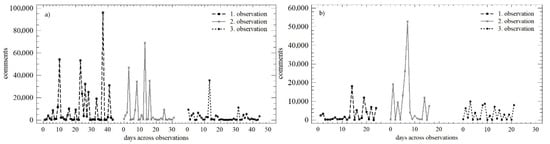 The development of the number of comments over time within the three observation periods is shown in Figure 4. During the working days, the trend could be described as declining, with smaller absolute differences in the individually monitored days. On weekends, the homogeneity across the individual observation periods was higher, which negated the Christmas period recorded within the second observation. The differences in the numbers of comments during the individual days persisted, but were smaller in absolute terms.