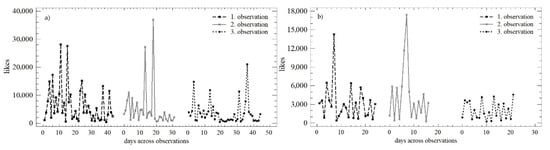Figure 6 shows the development of the number of likes over time within all three observation periods. During the working days, the trends were similar, with absolute differences in the individual monitored days that diminished over time. On weekends, the homogeneity in the first and the second observation periods was higher, which negate the Easter and Christmas periods recorded in these observation periods. The differences in the numbers of likes during the individual days persisted, but were smaller in absolute terms (especially in the third observation).