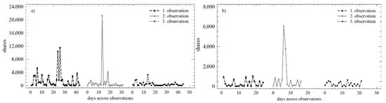 The differences in the two monitored parameters were confirmed as statistically significant for the number of shares during working days (LE = 4.097; p < 0.05; Q = 7.848; p < 0.05), i.e., in the three observation periods, there was a change in the mean value, as well as the variance. A partially opposite situation was recorded on weekends, where we found conformity at the level of the mean value (Q = 1.302; p = 0.521). The difference in the variance was confirmed (LE = 7.551; p < 0.01). Figure 9 shows the similarities in distribution functions during the individual observation periods (K-Sobs1 = 0.395; p < 0.05; K-Sobs2 = 0.141; p = 0.979; K-Sobs3 = 0.177; p = 0.738). Differences at the level of the mean value were confirmed only in the first observation in all cases when comparing the mean values (Wobs1 = 740.5; p < 0.01; Wobs2 = 279; p = 0.891; Wobs3 = 556; p = 0.419).