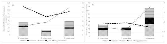 The effectiveness of the activities (posts) of the monitored institutions, considering the reactions in the forms of likes, comments, and shares, is shown using the engagement ratio in Figure 10. The trends monitored within the three observation periods were significantly different for weekends and working days. During the working days, after a significant decline in the second observation, a recovery in the third observation with greater customer activity in the form of shares was noticed. In the context of the change in the number of posts, the engagement ratio also doubled. During the weekends in the third observation, the interest of customers grew significantly, which was reflected in the significant growth of the engagement ratio.