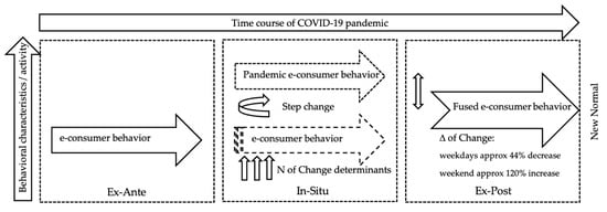 E-commerce underwent a significant stress test at the time of the onset of the global COVID-19 pandemic. Panic buying, partial closure of brick-and-mortar shops, and the overall market uncertainty created unprecedented conditions for all market players. The dominant players on the supply side of the market were able to adapt in a relatively short time, as their digital infrastructure benefited from previous thorough optimization. Market players that were long hesitant to decide on whether and when to start with the digital transformation were forced to improvise under the pressure of market survival. The demand side of the market also faced its challenges, in particular, the management of its own time, which represented a largely complex element with the increasing interest in working from home. Early analyses [,] pointed to the paradox of maximizing e-commerce benefits for customers, who shifted the dominant part of their online activities to working days in order to make use of additional benefits. As the pandemic progressed, the panic of online customers stabilized, and the accumulation of online activities within the working morning spread smoothly throughout the working day. Weekends, on the other hand, became a time of digital relaxation. The massive drop in online interactions recorded during weekends compared to the pre-pandemic standard—captured in the reference research []—was largely taken by surprise by the operators of the supply side of the electronic market. They responded to this with a year-on-year decrease in online activity during weekends, while their online activity remained unchanged during working days. In terms of regional specificity, the findings pointed to the fact that the similarity of government restrictive measures combined with the level of development of the online market generated relatively equal market responses to the evolution of e-consumer behavior patterns []. They also pointed to the fact that, in terms of the e-market development parameter, the digital market in the Czech Republic showed significant signs of above-average development. As for the trends in the development of e-consumer behavior itself, as the pandemic progressed, the steepness of the trends began to decrease. Based on the deepening of knowledge, as well as on the preliminary processing of the data from the second observation period, it could be assumed that a unique trend of behavior would grow, which would be a synthesis of the pre-pandemic and panic reactions from the times of the first wave of the pandemic. This assumption was confirmed by the data from the third observation period, based on which the delta of change necessary to complete the empirical model was identified.