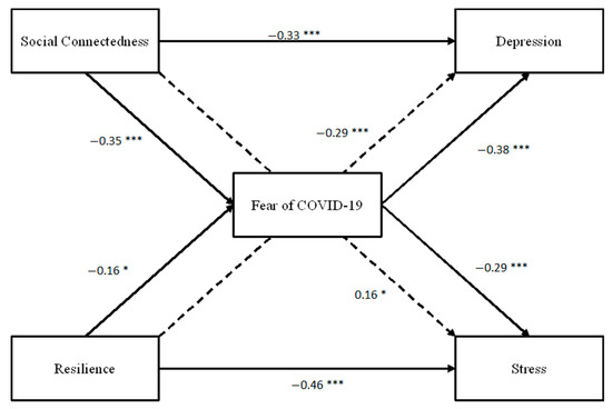 Examination of bias corrected bootstrap 95% confidence intervals indicated that, via Fear of COVID-19, there was a statistically significant indirect effect of social connectedness and depression (LCI = −0.18, UCI = −0.03, p = 0.011), and social connectedness and stress (LCI = −0.07, UCI = −0.01, p = 0.007). However, bias corrected bootstrap 95% CIs indicated that, via Fear of COVID-19, there was no statistically significant indirect effect of resilience and depression (LCI = −0.35, UCI = 0.05, p = 0.174), and no statistically significant indirect effect of resilience and stress (LCI = −0.14, UCI = 0.18, p = 0.182).