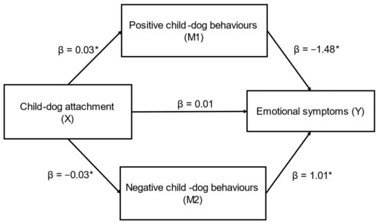 Positive and negative child–dog behaviours as mediators in the relationship between child–dog attachment and emotional symptoms (n = 83) (abcs = −0.33, large effect). Note: * = significant pathway.
