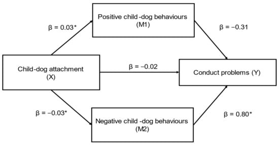 Positive and negative child–dog behaviours as mediators in the relationship between child–dog attachment and caregiver-reported conduct problems (SDQ) (n = 83) (abcs = −0.23, medium effect). Note: * = significant pathway.