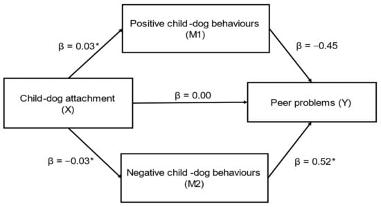 Positive and negative child–dog behaviours as mediators in the relationship between child–dog attachment and peer problems (SDQ) (n = 83) (abcs = −0.27, large effect). Note: * = significant pathway.