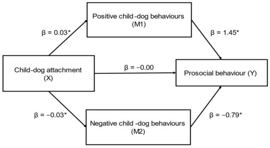 Child–dog attachment (X) had a significant indirect effect on caregiver-reported prosocial behaviour (SDQ) (Y) through caregiver-reported positive (M1) and negative (M2) child–dog behaviours (abcs = 0.38, large effect) (Figure 4); this was a complete mediation as the direct effect of X on Y was no longer significant when accounting for M1 and M2. In this model, both positive child–dog behaviours (β = 0.05) and negative child–dog behaviours (β = 0.02) were significant mediators. While positive child–dog behaviours was a marginally stronger mediator, the contrast between positive and negative child–dog behaviours was not significant (β = 0.01, SE = 0.04, CI’s: −0.001, 0.03).