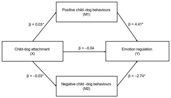 Positive and negative child–dog behaviours as mediators in the relationship between child–dog attachment and emotion regulation (ER) (n = 83) (abcs = 0.45, large effect). Note: * = significant pathway.