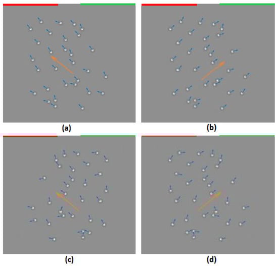 The participant’s task was to determine whether the average motion direction was to the left or right of the vertical and press the left key when the perceived motion direction was to the left and the right key when it was to the right. The observers’ responses were collected through the color-coded keys on a joystick controller. The keys on the left side of the response controller were colored in red and the keys on the right side in green to correspond to the colored lines in the uppermost part of the screen. A custom device processed the responses and transmitted them to a computer.