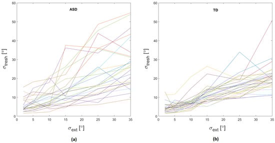 Figure 4 illustrates the dependence of the mean motion direction thresholds for the two groups of participants on the external noise levels and the fitted functions evaluated by Equation (1). For both groups, the thresholds gradually increase with the external noise. They are higher for ASD individuals than for TD subjects, and the difference between them increases with the heightening of the noise level.
