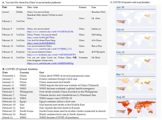 ‘You Are Not Alone China in social media, COVID-19 timelines, and world map. ‘You Are Not Alone For China’ in Shenzhen Daily official WeChat account, and the timeline of the version as recorded when it reached open-access international accounts (A), COVID-19 spread timeline with grey color indicating the period corresponding to the appearance of the cover version (B), and COVID-19 spread world map timeline from its beginning to the worldwide dissemination (C).