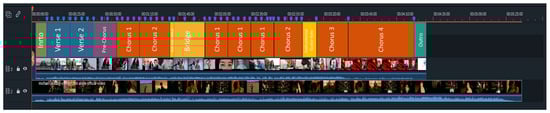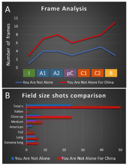 Finally, Figure 3 and Figure 4 illustrating the common parts of the original video, composed of 24 frames (Figure 3), and the version for China, show that now the same song structure is fragmented into 50 frames (Figure 4). Figure 5 shows the frame structure and composition for the rest of the song, composed of 98 frames. In the insets, the field size shots are depicted. As summarized in Figure 6, the frame analysis shows that the version is developed using an increased number (×2) of frames at each structural part of the song (see Figure 6A). As a total (see Figure 6B), 50 frames instead of the 24 capture the story’s intensity and speed. The field size shots comparison (Figure 6B) summarizes the enrichment of the visual storytelling with close-up shots (original: in 7 out of 24 shots; version: in 24 out of 50 shots). The Italian shot, an extreme close-up shot, and full shots are noted in the frames with more robust storytelling expression.