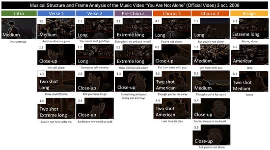 The analysis of the musical structure is illustrated in Figure 2. In the version for China, the rhyme scheme ‘AABB’ of the verses and four line stanzas was preserved, but the ballad’s musical structure was modified in its length, structure composition, and functional grammatical aspects. The ‘You Are Not Alone’ official music video (5:35 min) was reduced to 1:08 min (4:27 min duration). The instrumental intro, the two verses, the pre-chorus, and the two choruses followed the original song’s structure, but after a brief instrumental guitar solo that introduces the bridge, the subsequent original structure of Verse-Verse-(pre)-Chorus-Chorus-Bridge-extended Chorus-Ending (Repeat and Fade) was altered. Thus, the core Verse-Chorus cycle was broken in the version for China. Instead of the new cycle starting with two verses, Chorus 1 was created and reiterated three times, with a change in the background instruments (omission of the guitar) in the third repetition, followed by a fourth chorus, identical to Chorus 2. Then, an instrumental guitar solo built the song into the high intensity of the last two choruses. These choruses had a significant lyric change compared to previous ones. They retain ‘Stay strong’ (in Chinese) messages, but differ in background instruments: a guitar in Chorus 3 and a Chinese erhu violin in Chorus 4. The ending is a sudden stop.