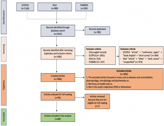 Initially, 2424 articles were retained from Scopus (n = 1166), WoS (n = 989), and PubMed (n = 269). Seventy articles were repeated and were thus excluded. Eighty-nine documents were retained after selecting them according to their theme and outlined goals, as shown in the PRISMA diagram below (Figure 1).