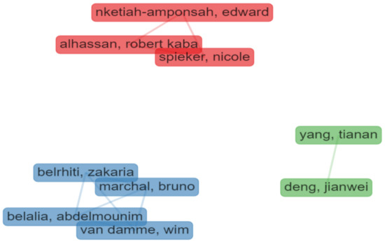 In the analysis of the authors’ collaborations, only one-shot collaborations were excluded (min. edge = 2), resulting in nine authors identified in three clusters (Figure 5):