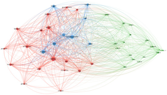 Their graphic representation is similar to the net visualization with three clusters, also represented by blue, green, and red (Figure 6). In Figure 6 and Table 6, the larger number of items corresponds to the more yellow and dense nodes. Three clusters (blue, red, and green) represent the data using the authors’ surnames. The interpretation of these data is described in Table 6.