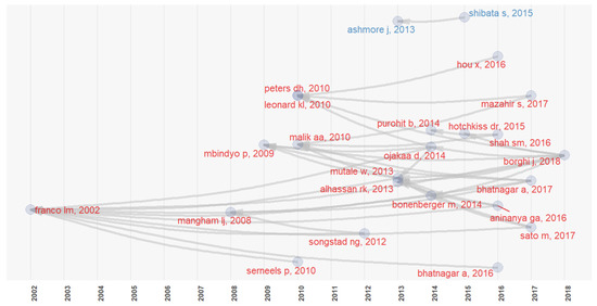 - Cluster 2 (in red) includes three authors from The Netherlands and Ghana and mostly pays attention to the quality of health services and human resources; and
