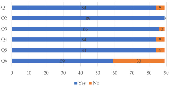 Overall, studies performed well according to the quality assessment checklist, as depicted graphically in Figure 8. Eighty-four studies clearly stated the aims of the conducted research (Q1), provided a clear and comprehensive description of the instruments and/or scales used (Q4), and presented a clear statement of the findings (Q5). All eighty-nine studies stated plainly the context of the study (Q2) and only three studies did not explicitly explain and use methods that supported the research in a clear manner (Q3). In turn, thirty studies did not discuss openly and extensively the limitations of their research (Q6).
