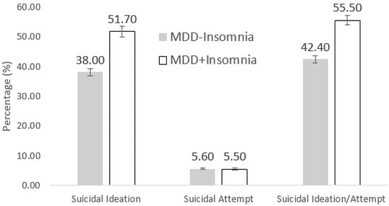 Insomnia is a common sleep disorder, characterized by difficulty falling or staying asleep, and it is associated with significant distress or impairment during the daytime and happens despite sufficient opportunity for sleep []. Insomnia and depression often present together. Though up to 24% of people with depression present with excessive sleep [], as many as 84.7% have trouble falling asleep or staying asleep []. Cross-sectional studies have shown a strong association between symptoms of depression and insomnia, and insomnia is longitudinally associated with the development of depression and poor treatment outcomes [,]. There exists a bidirectional relationship between insomnia and mood disorders, according to studies. In patients with insomnia and mood disorders, insomnia preceded the mood disorder in 41% of cases, the mood disorder preceded insomnia in 29% of cases, and the symptoms appeared at the same time in 29% of cases []. Insomnia is reported as an independent modifiable risk factor for suicide attempts [,] and suicide [,]. Insomnia, in particular, may confer higher risk for suicidal behavior in individuals with depression [] and insomnia’s association with suicidal ideation may be better explained by the presence of depression []. The mechanism behind sleep disturbances increasing the risk of suicidal behavior remains unclear. However, it is proposed that sleep disturbances worsen psychological suffering, rendering psychiatric patients more vulnerable to suicidal behavior to reduce or escape from such distress [,,]. In addition to that, fatigue after sleep difficulties may impair problem solving and decrease emotion regulation, increasing one’s risk for suicidal behavior through vulnerability to impulsive behavior []. Insomnia may be considered a clinical indicator of acute suicidal risk, particularly when it appears during a depressive episode []. Noting the observable and modifiable risk factors of suicidal behavior and understanding the relationship between insomnia and suicide in individuals with MDD is critical for suicide prevention efforts and providing high-quality care to our patients. There is a dearth of literature observing the relationship of MDD, insomnia, and suicide in the inpatient population. Thus, with this study, our main objective is to evaluate suicidal behavior in MDD patients with insomnia compared to those without insomnia from a nationwide inpatient sample from the years 2006–2015.