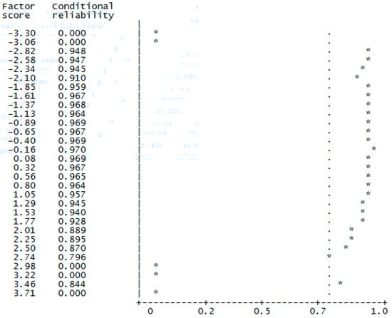 Furthermore, factor scores for the graded data were computed based on Bayes expected a-posteriori (EAP) estimation of latent trait scores [] with satisfying results: EAP reliability = 0.95, Factor Determinacy Index = 0.98. The strength and quality of the solution beyond pure model-data fit was also assessed by the Generalized H (G-H) index of construct replicability []. The H index evaluates how well a set of items represents a common factor. High H values (>0.80) suggest a well-defined latent variable, which is more likely to be stable across studies. Our findings produced satisfactory results: H-Latent = 0.86, [BC Bootstrap 95% Confidence intervals (0.815 − 0.882)], showing how well the factor can be identified by the latent response variables that underlie the observed item scores. Finally, the scale showed a satisfactory internal consistency reliability also using Sample 2 (Standardized Cronbach’s alpha = 0.84; McDonald’s omega = 0.84; greatest lower bound to reliability = 0.89). Quality and effectiveness of factor score estimates were evaluated by calculating the Factor Determinacy Index (FDI), EAP marginal reliability, and Sensitivity ratio (SR), as the number of different factor levels than can be differentiated on the basis of the factor score estimates, and expected percentage of true differences (EPTD), as the estimated percentage of differences between the observed factor score estimates that are in the same direction as the corresponding true differences. If factor scores are to be used for individual assessment, FDI values above 0.90, marginal reliabilities above 0.80, SR above 2, and EPTDs above 90% are recommended []. Outcomes are reported in Table 2. Conditional reliability’s function reports the statistical information corresponding to each score level of the latent trait. It is interpreted as the test information function in the IRT context. The graphic shows the conditional EAP/ORION reliability distribution, with the cut-off value of 0.80 as a vertical dotted line, against the factor standardized score estimates (M = 0.00; SD = 1.00) as “*” marks (Figure 1). The reliability of the scale is well-suited for low and central levels of social courage, which are those that can be used to detect deficiencies in the work organization. Together, these cumulative results support the psychometric properties of the Italian WSCS.